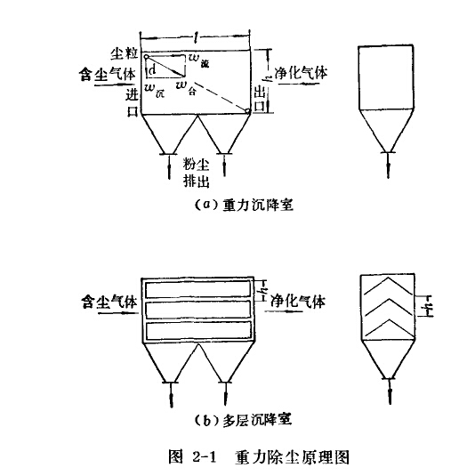 圖為重力除塵原理圖。w為粉塵的沉降速度,粉塵顆粒直徑越大沉降速度越快,粉塵密度越大沉降速度也越快。w為粉塵隨氣流流動的速度。粉塵實際流動的速度為w。如果直徑為d的粉塵穎粒進入沉降室(如圖所示的位置),當它到達沉降室出口時,正好沉降到底部,就被收了下來。很明顯,直徑小于d的粉塵顆粒由于沉降速度慢,還未沉到沉降室底部,就在出口處隨氣流跑了,收不下來,直徑大于d的粉塵穎粒由于沉降速度快,還未到達出口處就已沉降到沉降室底部。由此可見,密度相同的粉塵,直徑大的顆粒沉降在靠近進口端處;直徑小的顆粒沉降在靠近出口端處。