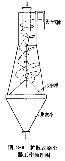 擴散式旋風除塵器是一種高效率捕集顆粒狀粉塵的除塵器,其原理如圖所示。實際上是一般旋風除塵器的改進,因此其基本原理與旋風除塵器相似。一般旋風除塵器內的外旋流到達頂后產生返回上升的內旋流。由于旋渦作用,能夠把一部分已經分離落下的粉塵重新卷起,被內旋流夾帶出去。這個作用對于旋風除塵器的效率降低影響很大,特別對于細顆粒粉塵更為顯著,因為細顆粒容易卷起。為了克服這個缺點,將圓錐體改為擴散式倒圓錐,便構成了擴散式旋風除塵器。擴散式倒圓錐的結構,可減少四周含塵氣體自筒體中部短路流向中心排風管的可能。另外在底部裝有圓錐形反射屏,塵粒可沿筒壁反射屏間的環隙向下沉降進入集塵斗。大部分氣體沿著反射屏流向中心部分形成內旋流,少量氣體隨粉塵進入集塵斗,經反射屏頂部小孔返回內旋流,因此防止了內旋流卷吸已分離落下的粉塵,有效地減少了內旋流夾帶的粉塵,提高了除塵效率。