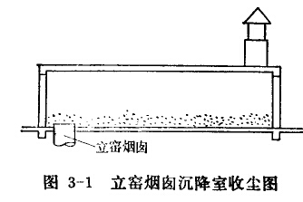 采用沉降室時,通常將它布置在立窯廠房的頂部或旁邊,如圖所示。沉降室的除塵效率除與顆粒本身的重度和直徑有關外(重度和直徑越大效果越好),還取決于粉塵(或氣體)的流動速度,以及沉降室的橫截面積和長度。氣體在沉降室內的流動速度,一般可取0.3-0.5來/秒,停留時間要求30-60秒。氣流速度越低,沉降室長度越長,則除塵效率越高。但是,由于窯上空間的限制,沉降室的體積不能建得很大。所以,一般沉降室的效率比較低,僅能沉降0.2毫來以上的粗顆粒。