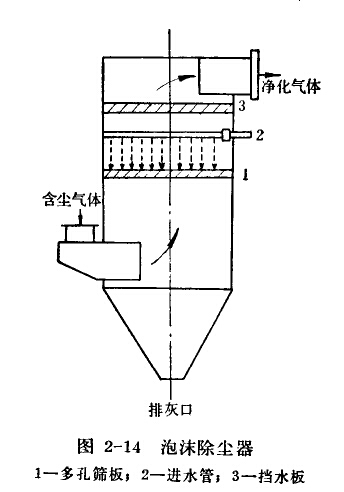 泡沫除塵器是一種清洗式除塵設備,如圖所示。含塵氣體由底部進入筒體,由于慣性力的作用,較大粗穎粒落入筒底。當含塵氣體通過多孔篩板時,一與篩板上面的水接觸,形成擾動較大的泡沫層,泡沫層就使含塵氣體和液體的接觸面大大增加,借此達到氣體水浴的目的,清洗氣體的污水經除塵器底部的錐體排出。為了防止清洗后氣體將水滴帶到除塵器管道中,除塵器筒體上部設有擋水板。
