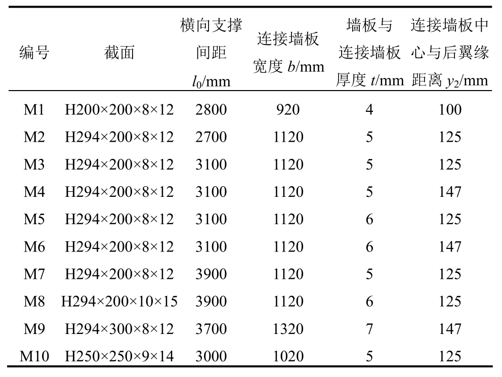 依據(jù)實際中常規(guī)的除塵器殼體結(jié)構(gòu)幾何參數(shù),設計了10例基礎研究模型,幾何參數(shù)如表1所示。這些模型涵蓋了大型、中型、小型除塵器的幾何尺寸,確保研究結(jié)果具有普遍性。實際除塵器一般布置有多跨圍護墻板,以保證收塵效果。為簡化模型,提高計算效率,僅取兩跨墻板建模。中間雙肢組合柱截面如圖1(b)所示。H型鋼柱與墻板直接相連的一側(cè)翼緣稱為后翼緣,不受墻板約束的立柱翼緣稱為前翼緣。連接墻板與兩肢立柱的腹板通過焊接連接。立柱總高度H,橫向支撐間距l(xiāng)0 (即連接槽鋼間距,亦為單肢立柱繞y軸的計算長度),殼體墻板寬度w,連接墻板寬度b,墻板與連接墻板壁厚t,連接墻板中心與后翼緣距離y2。