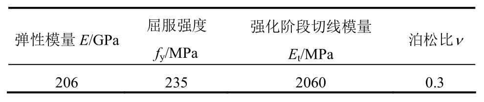 采用ANSYS有限元程序進行數(shù)值分析,選用Shell181單元對所有結(jié)構(gòu)構(gòu)件進行模擬。材料參數(shù)如表2所示。鋼材本構(gòu)采用雙線性等向強化模型,以米賽斯準則判斷是否發(fā)生屈服。考慮幾何非線性影響,采用弧長法跟蹤結(jié)構(gòu)響應路徑。