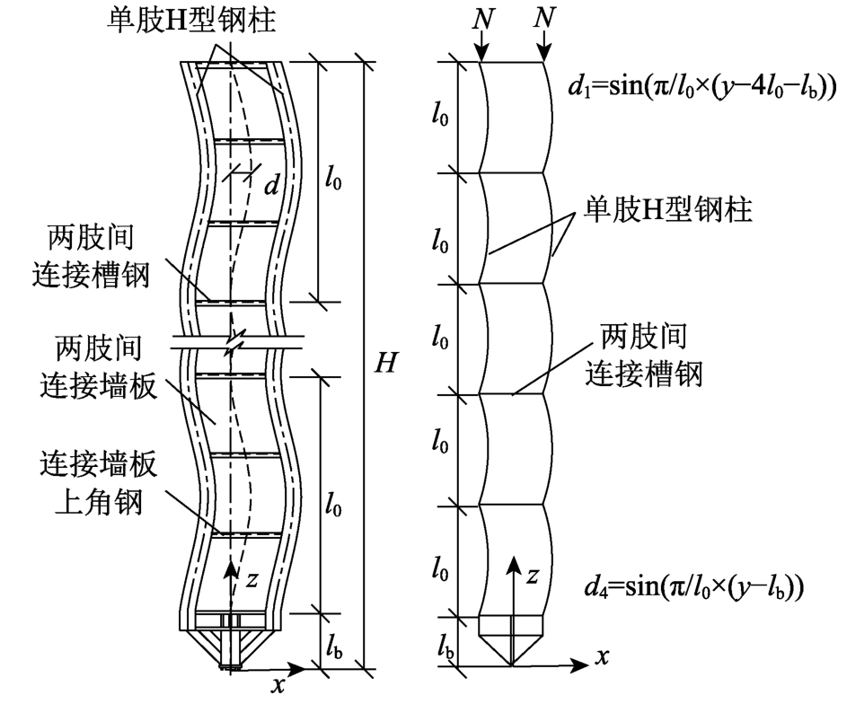 基于這樣的推斷,建模時首先對中間兩肢H型鋼柱在各連接槽鋼區(qū)間(連接槽鋼可視作H型鋼柱的側(cè)向支撐)構(gòu)造了繞y軸的正弦半波形式初始幾何缺陷,形成初始彎曲變形,缺陷形式如圖3所示。缺陷幅值δ取千分之一柱高。