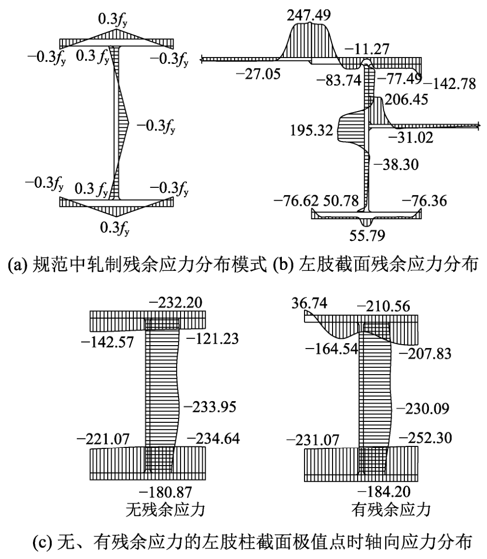 為考察殘余應力對立柱軸壓承載能力的定量影響,將利用實體單元進行軋制與焊接過程模擬形成的殘余應力分布簡化后引入殼單元構(gòu)建的結(jié)構(gòu)體系有限元模型進行非線性計算,計算結(jié)構(gòu)在有、無殘余應力時的穩(wěn)定承載力。對于不同構(gòu)造與尺寸的模型M1和M5,考慮殘余應力后的穩(wěn)定承載力分別為未考慮殘余應力的0.971倍與0.989倍,減小幅度均不超過5%。同一截面上,無、有殘余應力情況左肢立柱截面達到極限承載力時的軸向應力分布如圖4(c)所示。立柱的失穩(wěn)主要體現(xiàn)為前半部分截面的失穩(wěn),在無殘余應力情況荷載達到極值時,腹板與前翼緣組成截面的壓應力分布較為均勻,基本接近全截面屈服的水平。殘余壓應力的存在可能會透支一定前半部分截面應力增加空間,但圖4(b)表明,多步加工使得前腹板與前翼緣上的殘余拉、壓應力分布基本平衡,殘余應力引起初始軸向內(nèi)力合量不超過該部分截面屈服荷載的5%。圖4(c)表明,有、無殘余應力情況最終發(fā)生破壞時的立柱截面軸向應力分布差異不大,有殘余應力時前翼緣的壓應力水平更高一些。在有、無殘余應力時,分別對H型鋼前半部分截面軸向加載階段計算應力增量積分(即前半部分截面的軸向內(nèi)力加載量),繼而求出比值,M1模型有、無殘余應力情況軸力增量比值為0.983,M5模型有、無殘余應力情況軸力增量比值為0.982。可見,由于易于發(fā)生失穩(wěn)的H型鋼前半部分截面殘余應力基本平衡,且達到極限承載力時截面處在一個較為均勻的高壓應力水平,因此殘余應力的影響不大。考慮到由于殘余應力的存在立柱承載力減小幅度不超過5%,且這種影響對于不同構(gòu)造立柱差異不大,因此,為簡化計算,后續(xù)有限元模型中不再引入殘余應力,而用一個偏于安全的折減系數(shù)來反映殘余應力的不利影響。