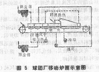 就移動爐蓖而言,包括烘干、硬化和冷卻在內的全部工藝過程,,都在一臺設備上進行,移動爐蓖攜帶著球團通過各段、從圖5可知,在爐蓖上下均裝有抽風箱或排煙罩:這裝置用于供給加熱過程所所需氣體或納出廢氣。