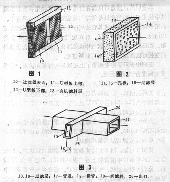 圖2中,過濾器的殼狀支撐構造是由透氣性的板組成的,如有孔板14和15,在這中間保持著由石墨化的有機纖維或礦棉纖維構成的濾料層或絮狀物16.
