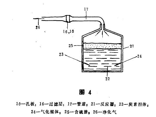 在圖4中表示了備有金屬鍋融浴的煤氣化反應器21,如鐵熔融礦物,在熔爐表面下方的炭素擔體23,微粒碳及氧化性氣化媒體24,在熔融浴表面上保持著含硫渣25,由沒有硫的Co和H2組成的約1300-1450℃的生成氣通過管道吸收凈化了的生成氣26,對于后面的冶金還原過程是較合適的.’諸如對發電用的氣體透平的燃燒。