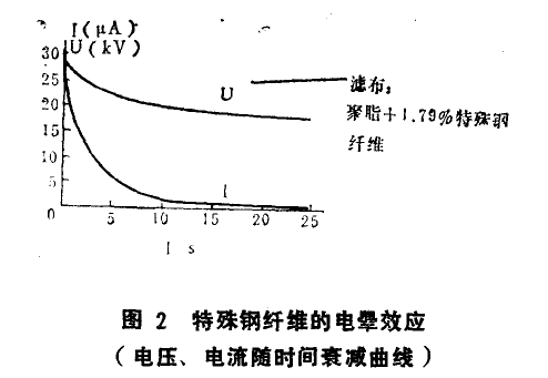 含1.790%特殊鋼纖維的濾料樣品的電暈電流被記錄下來,電容器的初始負荷相應于30KV開關打開時的瞬間負荷,電暈電流在25s內從28mA減少到0.3mA(見圖2 ).從電流曲線能核驗電路中的能量衰減,并以此確定金屬球體上每一時刻相應的電壓.電壓(U)曲線表明了金屬球體的時間一能量電壓變化.在4 cm的給定距離上,電壓從30KV迅速降到19KV,靜電場場強從750KV /m減弱至470KV /m,因而燃燒能量從4500mJ降到1900mJ,
