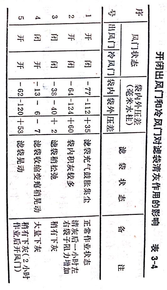 從表3-4可以看出,收塵器在正常工作時,出風門是開的,冷風門是閉的,此時袋內(nèi)壓力總是大于袋外壓力,濾袋在充氣張開狀態(tài)下收塵。當出風門與冷風門都關(guān)閉時,袋內(nèi)外壓力基本處于平衡,袋內(nèi)部分附灰靠自重墮落,但緊靠在袋壁的附灰仍附著在濾袋內(nèi)。當出風門和冷風門都打開時,因冷風竄入過濾室,而發(fā)生濾袋晃動,使袋內(nèi)附灰振落一部分,但仍有部分附灰附著在濾袋內(nèi)。唯有當出風門關(guān)閉,冷風門打開時,袋外壓力大于袋內(nèi)壓力袋子收縮變癟,才使附著袋內(nèi)的全部灰層脫落到集塵斗中去。